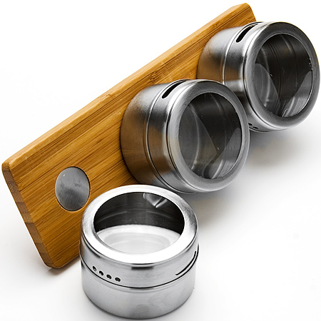 Этот набор включает в себя 3 баночки для специй, расположенных на бамбуковой магнитной пластине, благодаря чему емкости не потеряются и всегда будут у вас под рукой. Предметы набора выполнены из высококачественной нержавеющей стали.