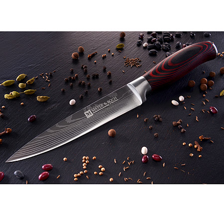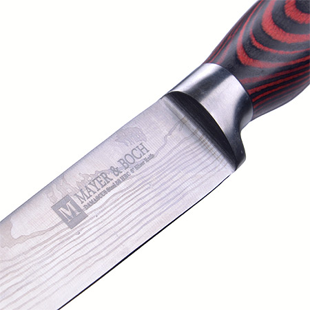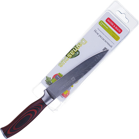 Нож MAYER&BOCH изготовлен из высококачественной дамасской стали, обеспечивающей высокие режущие свойства кромки клинка. Нож имеет острое лезвие с ровной поверхностью и выверенным углом заточки, а также имеет специальную закалку металла для повышения прочности. Поверхность клинка легко моется, не впитывает и не «передает» запахи пищи при нарезке продуктов. Этот нож идеально подойдет для нарезки крупных твердых овощей и фруктов, разделки курицы, крупной рыбы или мяса, широкой боковой стороной лезвия удобно давить чеснок. Тщательно разработанный дизайн рукоятки и ее качество, позволяют ножу удобно располагаться в руке. Нож изготовлен из экологически чистых материалов, легок и прост в эксплуатации и уходе.