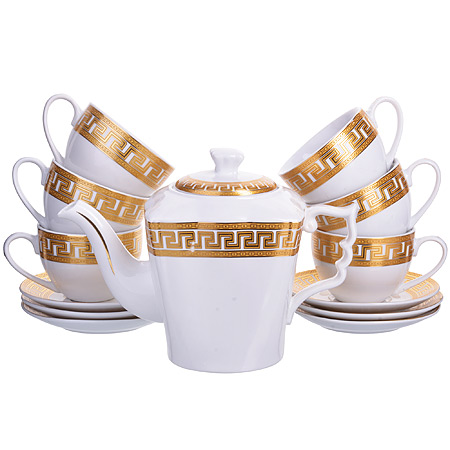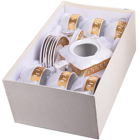 ОписаниеЧайный набор LORAINE на 6 персон выполнен из высококачественного фарфора белого цвета и украшен золотым орнаментом. Изящный дизайн придется по вкусу и ценителям классики, и тем, кто предпочитает утонченность и изысканность. Набор упакован в стильную подарочную коробку, оформленную изнутри белой атласной тканью. Каждый предмет надежно зафиксирован внутри коробки благодаря специальным выемкам. Чайный набор - идеальный и необходимый подарок для Вашего дома и для Ваших друзей в праздники, юбилеи и торжества! Также он станет отличным корпоративным подарком и украшением любой кухни. Подходит для мытья в посудомоечной машине. В наборе: 6 чашек, 6 блюдец и заварочный чайник.