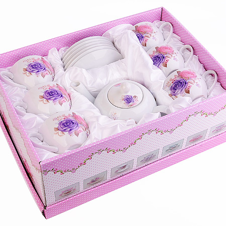 Чайный набор LORAINE на 6 персон выполнен из фарфора высокого качества и оформлен красивым цветочным рисунком. Изящный дизайн придется по вкусу и ценителям классики, и тем, кто предпочитает утонченность и изысканность. Набор упакован в стильную подарочную коробку, оформленную изнутри белой атласной тканью. Каждый предмет надежно зафиксирован внутри коробки благодаря специальным выемкам. Чайный набор - идеальный и необходимый подарок для Вашего дома и для Ваших друзей в праздники, юбилеи и торжества! Также он станет отличным корпоративным подарком и украшением любой кухни. Подходит для мытья в посудомоечной машине. В наборе: 6 чашек, 6 блюдец и заварочный чайник.