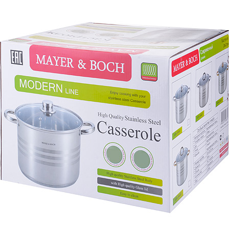 ОписаниеКастрюля с крышкой MAYER&BOCH выполнен из высококачественной нержавеющей стали с многослойным термоаккумулирующим дном, способствующим высокой теплопроводности и равномерному распределению тепла. Нержавеющая сталь обладает высокой устойчивостью к коррозии, не вступает в реакцию с холодными и горячими продуктами и полностью сохраняет их вкусовые качества. Посуда идеальна для приготовления здоровой пищи с минимальным количеством жира, что обеспечивает снижение потери витаминов, минеральных веществ и сохраняет аромат приготовленных блюд. Посуда очень удобна в использовании и элегантна.Крышка выполнена из термостойкого стекла с металлическим ободком и отверстием для выхода пара. Подходит для использования на всех типах плит, включая индукционные. Подходит для мытья в посудомоечной машине.
