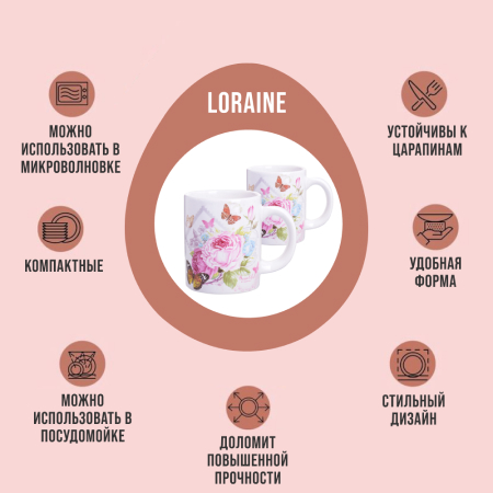 Кружка LORAINE создана для истинных ценителей холодных и горячих напитков. Изготовлена из БИО и ЭКО доломитовой керамики высокого качества, и украшена красивым рисунком. Посуда, сделанная из доломита, поражает своей невесомостью, он совершенно безопасен. Поэтому, даже спустя несколько лет, чашка будет выглядеть точно так же, как и в день, когда вы начали ей пользоваться. Изделие имеет удобную, изящную ручку. Холодными вечерами из этой красивой посуды приятно выпить чая за просмотром любимого сериала, а ранним утром взбодриться глотком горячего кофе планируя список дел на день. Чашки большие, поэтому не стоит беспокоиться, что любимый напиток быстро закончится и вы не успеете им насладиться в полной мере. Их стильный дизайн придется по вкусу и ценителям классики, и тем, кто предпочитает утонченность и элегантность. Кружки подходят для горячих и холодных напитков, для чая и кофе. Кружка для чая станет прекрасным дополнением к Вашему чаепитию вместе с семьей или друзьями. Можно использовать в микроволновой печи и можно мыть в посудомоечной машине, а это в свою очередь позволяет сэкономить огромное количество времени и сил. Использование этой керамической кружки будет делать каждый новый день настоящим праздником и принесет эстетическое удовольствие!