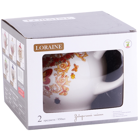 ОписаниеЗаварочный чайник с крышкой LORAINE поможет вам в приготовлении вкусного и ароматного чая, а также станет украшением вашей кухни. Он изготовлен из доломитовой керамики в красивых тонах и оформлен красочным изображением. Нежный рисунок придает чайнику особый шарм, чайник удобен в использовании и понравится каждому. На крышке чайника есть выступ, удерживающий ее от падения при наклоне. В носике чайника есть перегородка с несколькими небольшими отверстиями, которая позволяет пропускать жидкость задерживая крупные чаинки. Такой заварочный чайник станет приятным и практичным подарком на любой праздник. Подходит для мытья в посудомоечной машине.