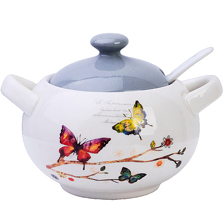 Сахарница с крышкой 375мл с ложкой 3пр Бабочки в саду доломит LR (х36).