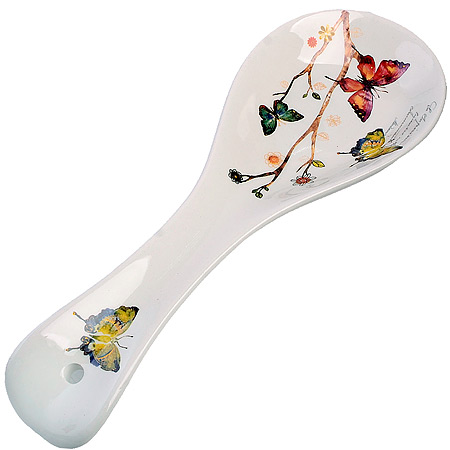 Подставка под ложку LORAINE - это функциональное решение для вашей кухни. Подложка выполнена из высококачественной доломитовой керамики с красочным цветочным рисунком с бабочками. Может служить подставкой под разнообразные кухонные принадлежности, таких как вилки, ножи и половники. Например, так удобно при жарке продуктов на сковороде использовать ложку-подставку для лопатки. Там она не загрязнит ни стол, ни другую посуду. Более того, даже обычную суповую ложку можно класть на неё. С помощью такой подставки следить за чистотой станет просто и приятно. Она выполнена таким образом, что ложка на ней стоит с лёгким наклоном, поэтому её легко брать и ставить на место. Подложечик также может служить украшением кухни, благодаря своему яркому дизайну и качественным материалам. Изделие легко моется и не требует специального ухода, можно мыть в посудомоечной машине. Пригодна для использования в холодильнике, морозильнике, микроволновой печи. Наслаждайтесь чистотой и гармонией на вашей кухне с подставкой под столовых приборы, которая поможет сохранить комфорт и порядок. Эта красивая посуда, очень полезный и нужный подарок на День рождения, Новый год, на новоселье, для мамы, бабушки, подруги.