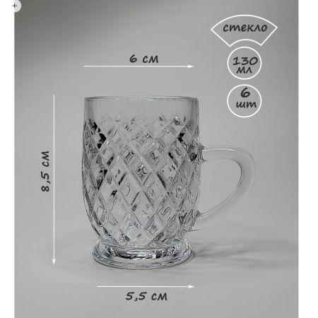 Набор из 6-ти кружек с ручкой выполнен из высококачественного стекла. Стильный набор кружек предназначен для подачи горячих и холодных напитков. Оригинальный дизайн, уникальная форма, прозрачные стенки придают набору невероятную эстетичность. Кружки подойдут для повседневного использования как в домашних условиях, так и в местах общественного питания (кафе, бары, рестораны). Посуда обладает непористой поверхностью, не впитывает запахи, легко моется.